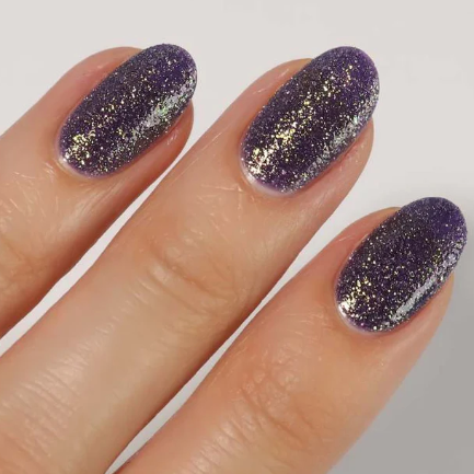 Belladonna is a deep violet nail polish with gold to green to blue color shifting shimmer and dazzling reflective sparks. The Spotlight Shimmers™ combine glimmering shimmer pigments and flash reflective glitters which illuminate your nails with direct lighting.