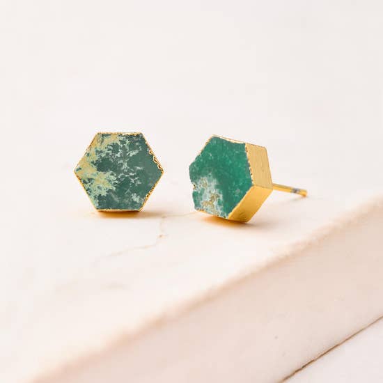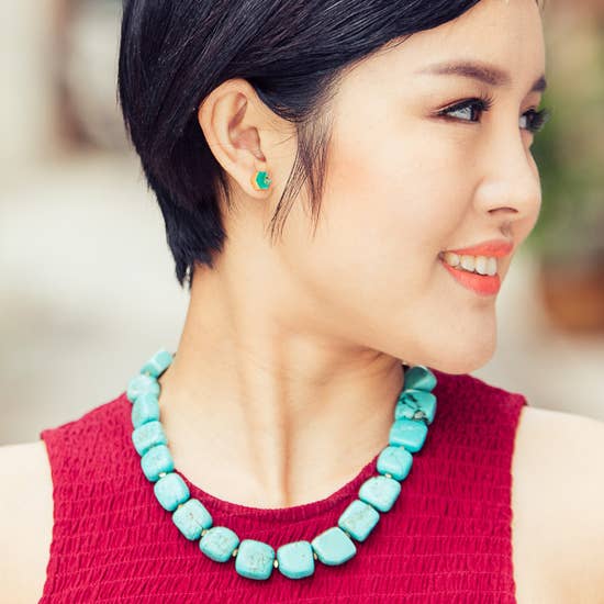 These geometric studs with genuine turquoise stones are classic, tasteful, and will add a cheerful pop of color to any outfit. Natural stones may vary in color and size.