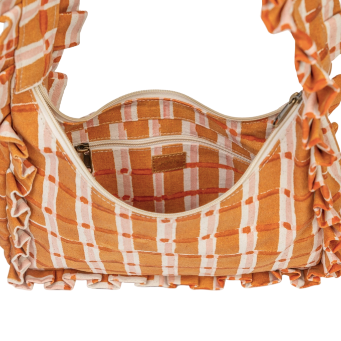 The go-to statement shoulder bag is handcrafted from hand block printed canvas with frill detailing that reminds us of our favorite Nepali street food, Momos. Roomy enough for all your everyday essentials with zip closure and comfortable shoulder strap.