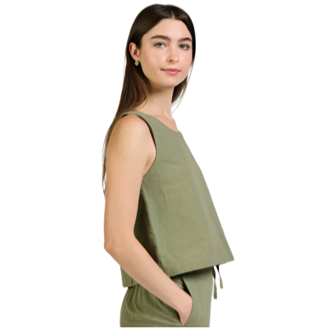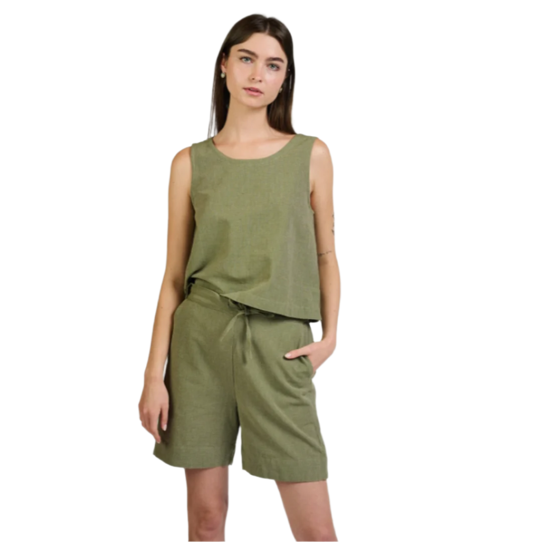 We love this olive chambray tank! In the classic shell style, you can pair this with shorts, jeans or wear it to work with a blazer and trousers. It's a flattering classic style with a modern twist.
