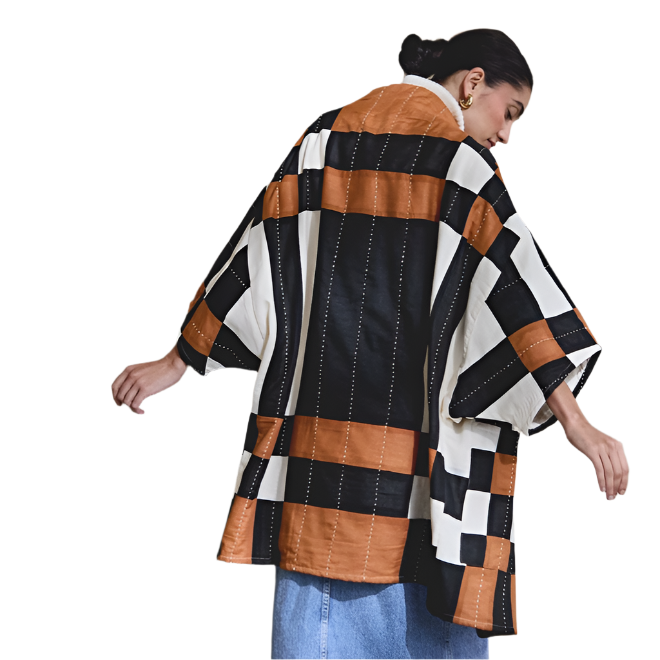 Indulge in the luxurious feel of this medium-weight quilted jacket, carefully crafted from six layers of 100% organic cotton. Its striking design, inspired by black and natural white marquise patterns, showcases our iconic cocoon silhouette and features a structured neckline, drop shoulder sleeves, and concealed side pockets. Layer it over any all-black outfit to turn heads all season long.