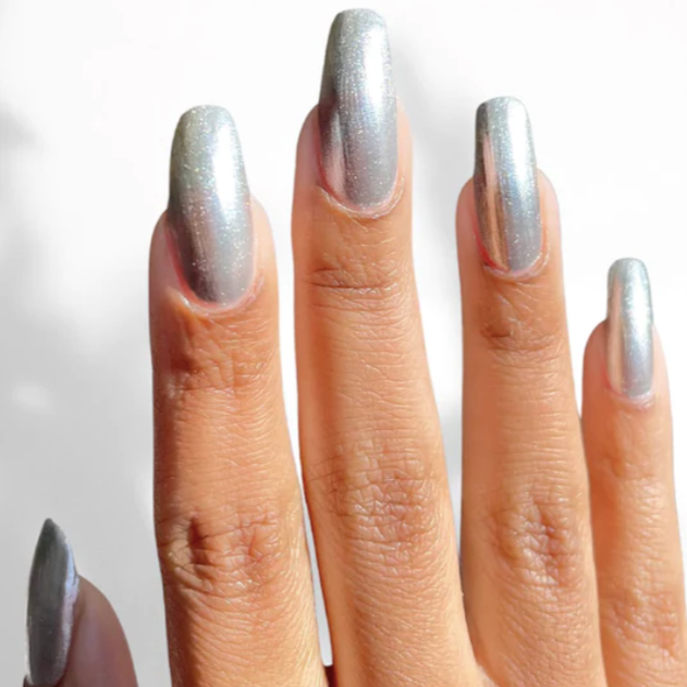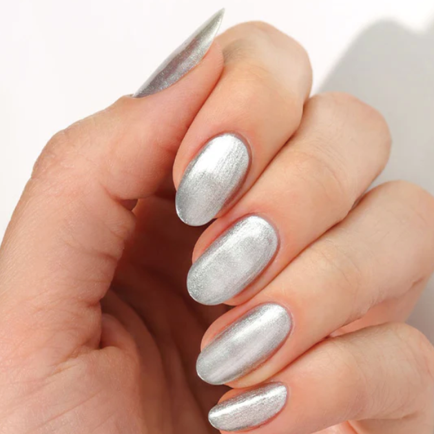 Sterling is a brushed silver metallic nail polish. Understated and minimalist, brushed silver is the antidote to flashy gold and blinding diamonds. This chromatic polish builds a 925-sterling silver effect that complements your earrings, necklaces, bracelets, and rings.