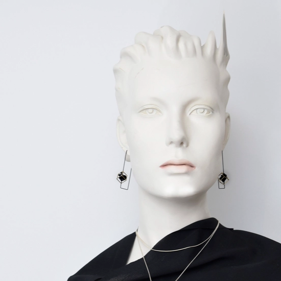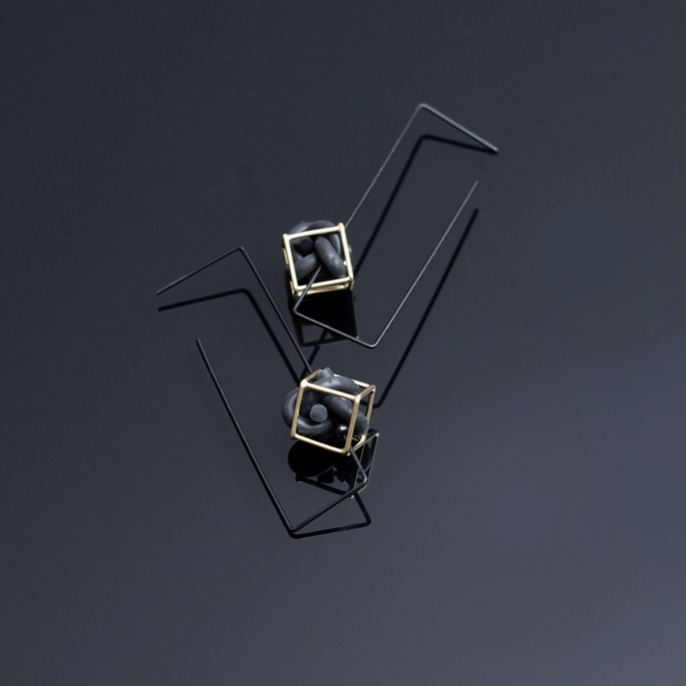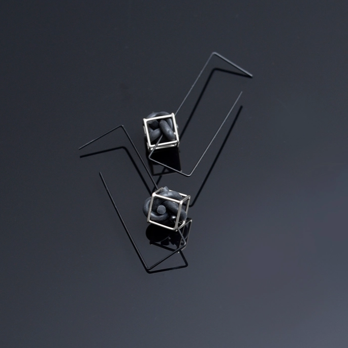 A cord-tied loop suspends within the rigid geometry of the rectangular frame, creating a subtle yet deliberate contrast: fluid versus fixed, curve against corner. Sculptural in silhouette yet lightweight in presence, the Veer hoops explore balance in tension — a quiet composition of opposites, refined for everyday asymmetry.